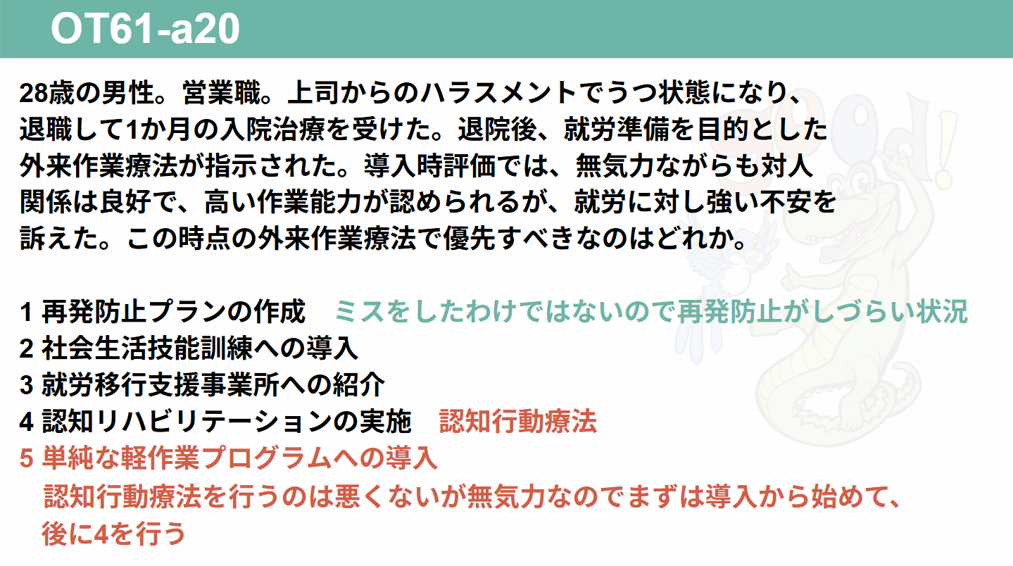 作業療法を導入するうえで選択肢1は最も無難な選択肢であるため、当塾では適切と判断した。